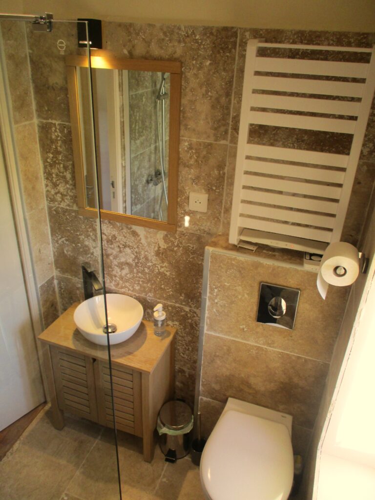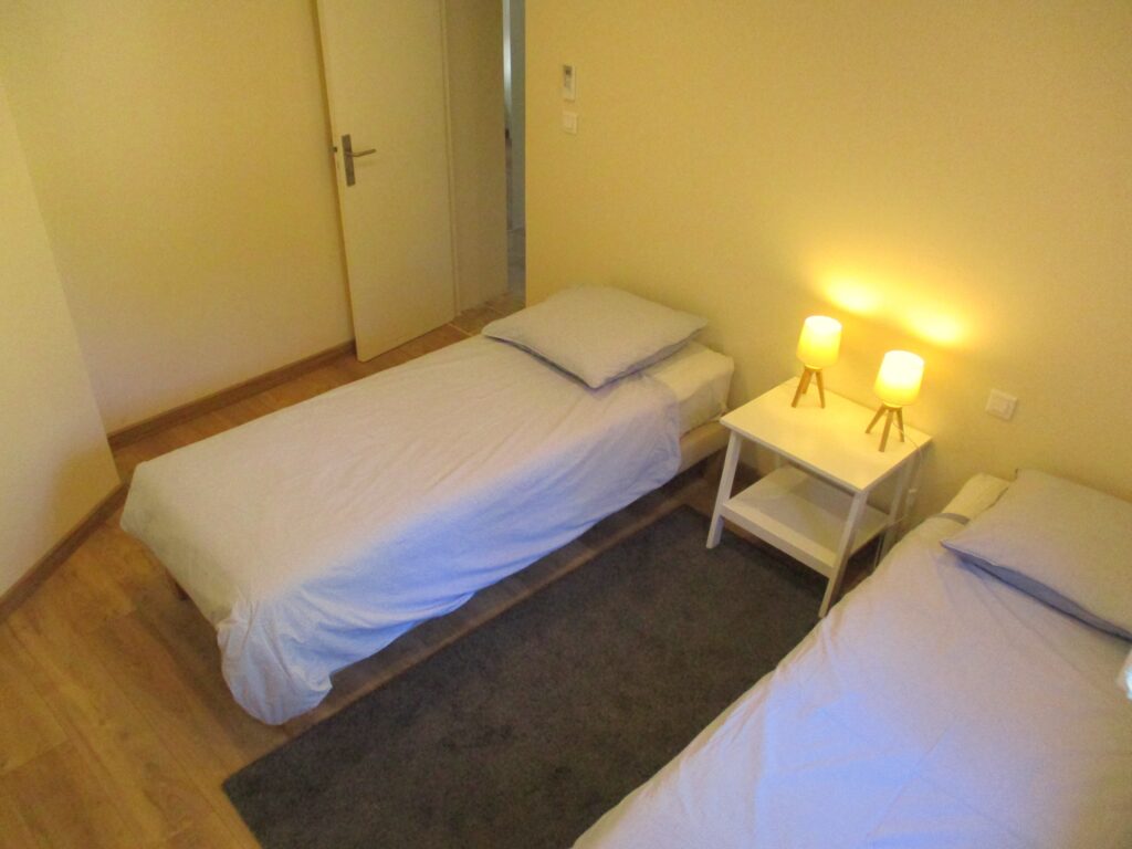 - Au rez-de-chaussée, chambre n°3 avec 2 lits simples (90X200), chambre n°4 avec un lit simple et WC séparé. Grande salle de bains avec douche, WC, 2 lavabos.
